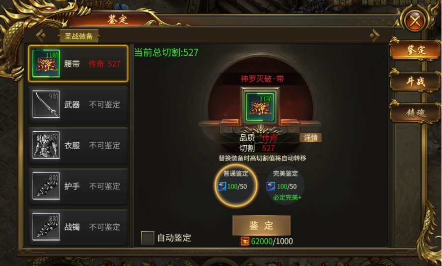 2、可分为普通和完美鉴定,需要消耗鉴定石以及元宝或者钻石。